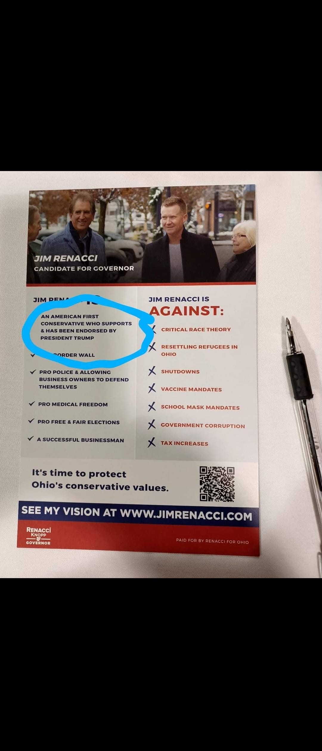 Renacci’s campaign is distributing fliers for his gubernatorial bid that tout the Republican as “an American first conservative who supports and has been endorsed by President